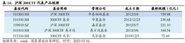 沪深300指数共有22只产品布局,其中19只被动ETF,3只主动增强ETF,整体发展较为充分。从规模角度看,大于150亿元的产品有四只,但华泰柏瑞沪深300ETF规模达到了739.98亿元,显著高于其他产品,优势明显。