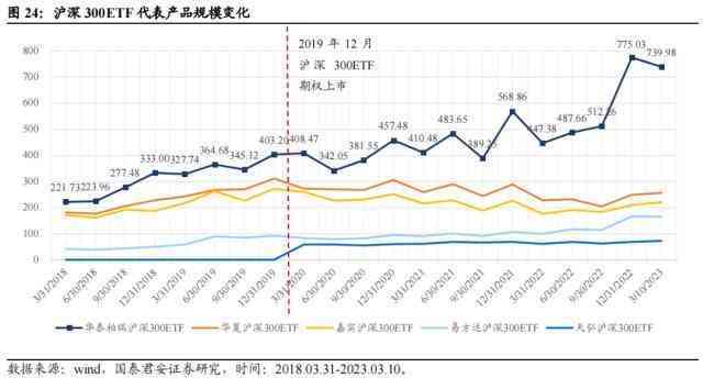 实际上,这些产品中,除了天弘沪深300ETF成立时间较晚外,其余产品的成立时间均较早,首发优势不明显,但从近五年来的规模变化情况看,华泰柏瑞沪深300ETF却逐渐拉开了与同类产品之间的规模差距。我们认为,相关指数衍生品上市后,基于衍生工具的量化策略建仓需求会推动相关头部ETF产品受益。例如,2019年12月,上海证券交易所上市了沪深300ETF期权,标的产品为华泰柏瑞沪深300ETF(510300),自2020年以来,该产品的规模接近翻倍,同类产品规模却有所下滑。