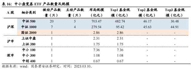 存续中小宽基指数ETF产品主要布局于中证500指数与中证1000指数。目前,跟踪这两条指数的产品规模分别为703.47亿元、279.54亿元。