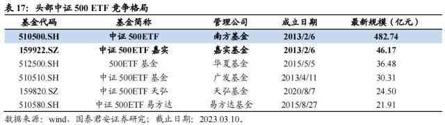 同样作为中小盘指数的中证500和中证1000,相较于大盘宽基指数中证50和沪深300,受到衍生品上市带来的规模和交易量上的增量更为明显,而头部产品在其中受益最多。体现在竞争格局上,则是南方基金的两只ETF产品,南方中证500ETF(510500)和南方中证1000ETF(512100)由于发行时间较早,在衍生品上市前就已经积累了一定的规模优势,而在相关衍生品上市后,其龙头优势延续。