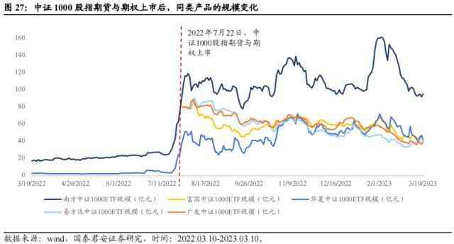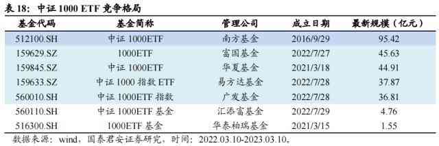 中证1000股指期货与期权上市后,中证1000指数赛道迅速扩容,多家基金公司发行对应指数ETF产品,加剧了该赛道的竞争,而赛道龙头产品南方中证1000ETF,成立时间早,规模大,具备先发优势,因此在衍生品上市后,规模扩张较快。截止到2023年3月10日,南方中证1000ETF规模95.42亿元,在所有产品中拔得头筹。