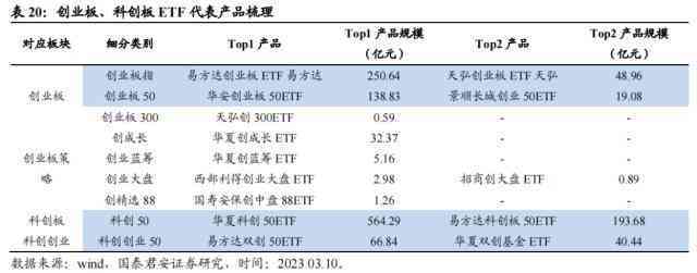 创业板、科创板相关ETF共计47只,管理规模合计1729.05亿元,主要布局在4个大方向:1)创业板宽基指数,如创业板指、创业50、创业300;2)创业板相关策略指数,如创成长、创蓝筹、创业大盘等;3)科创板宽基指数,如科创50;4)科创创业指数,如双创50指数。从规模分布的角度上看,主要宽基指数布局多数趋向饱和,如创业板指、创业板50。科创50等,但双创50指数竞争格局还较为激烈,头部基金公司的产品规模差距较小。另一方面,一些基金公司选择从Smart Beta的角度出发,另辟蹊径。
