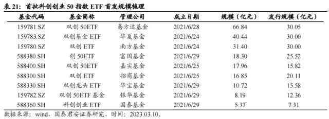 同期同台竞争,头部管理人资源优势凸显,如2020年四只科创50ETF的竞争:同期发行四只产品,华夏基金与易方达基金在竞争中脱颖而出,自发行开始份额便保持大幅领先。