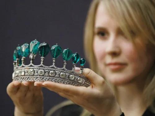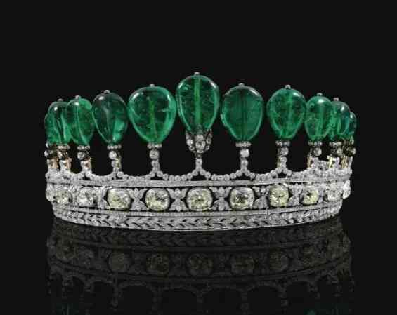 这顶精致的祖母绿和钻石头饰是在 1900 年左右为凯瑟琳娜·亨克尔·多纳斯马克公主定制的。据报道,这件作品由巴黎珠宝品牌尚美巴黎创作,由 11 颗重达 500 多克拉的稀有哥伦比亚祖母绿梨形水滴组成,仅在皇室成员在场时佩戴。