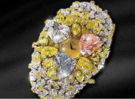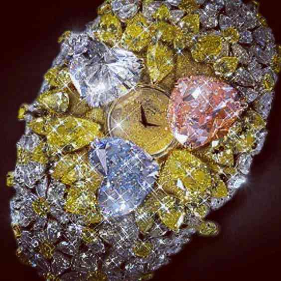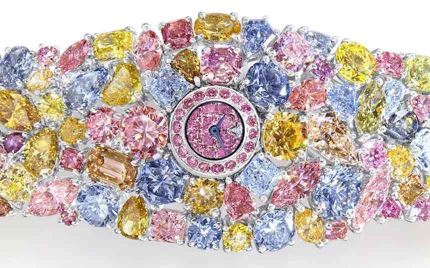 这款令人惊奇的手表有 874 颗不同颜色和大小的高级钻石。三颗最大的钻石呈心形,颜色从粉红色到蓝色再到白色不等。