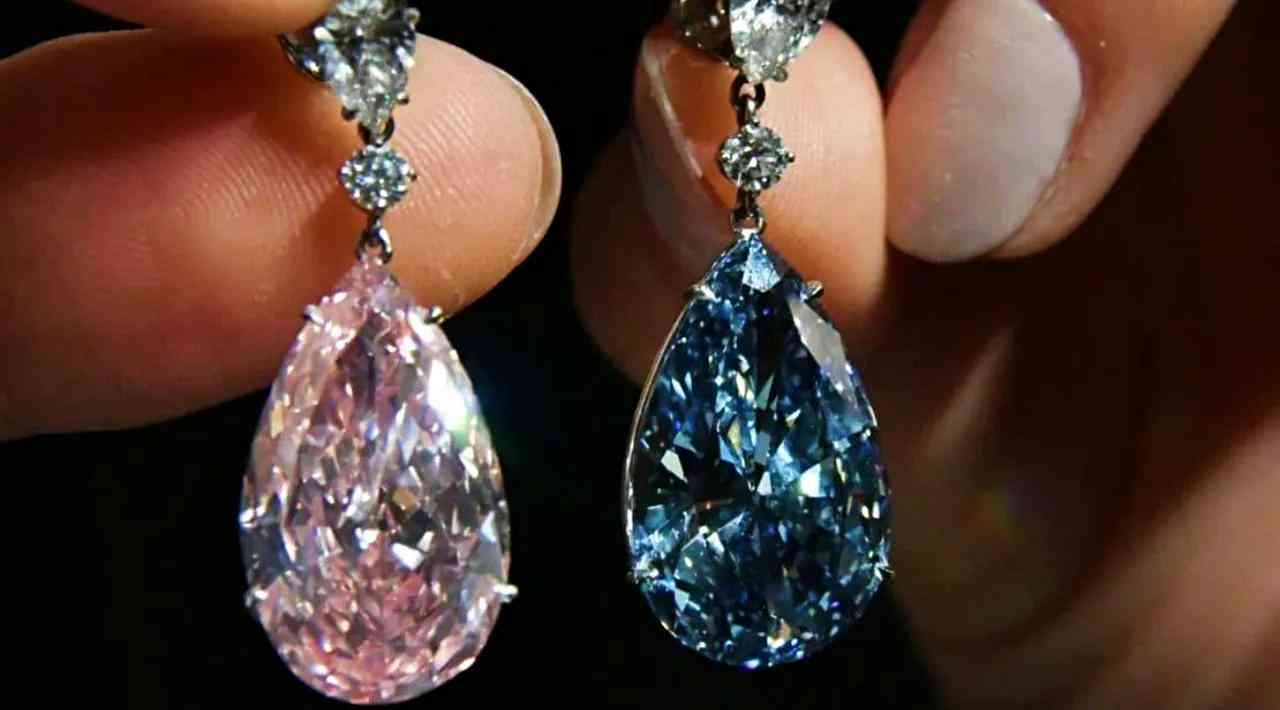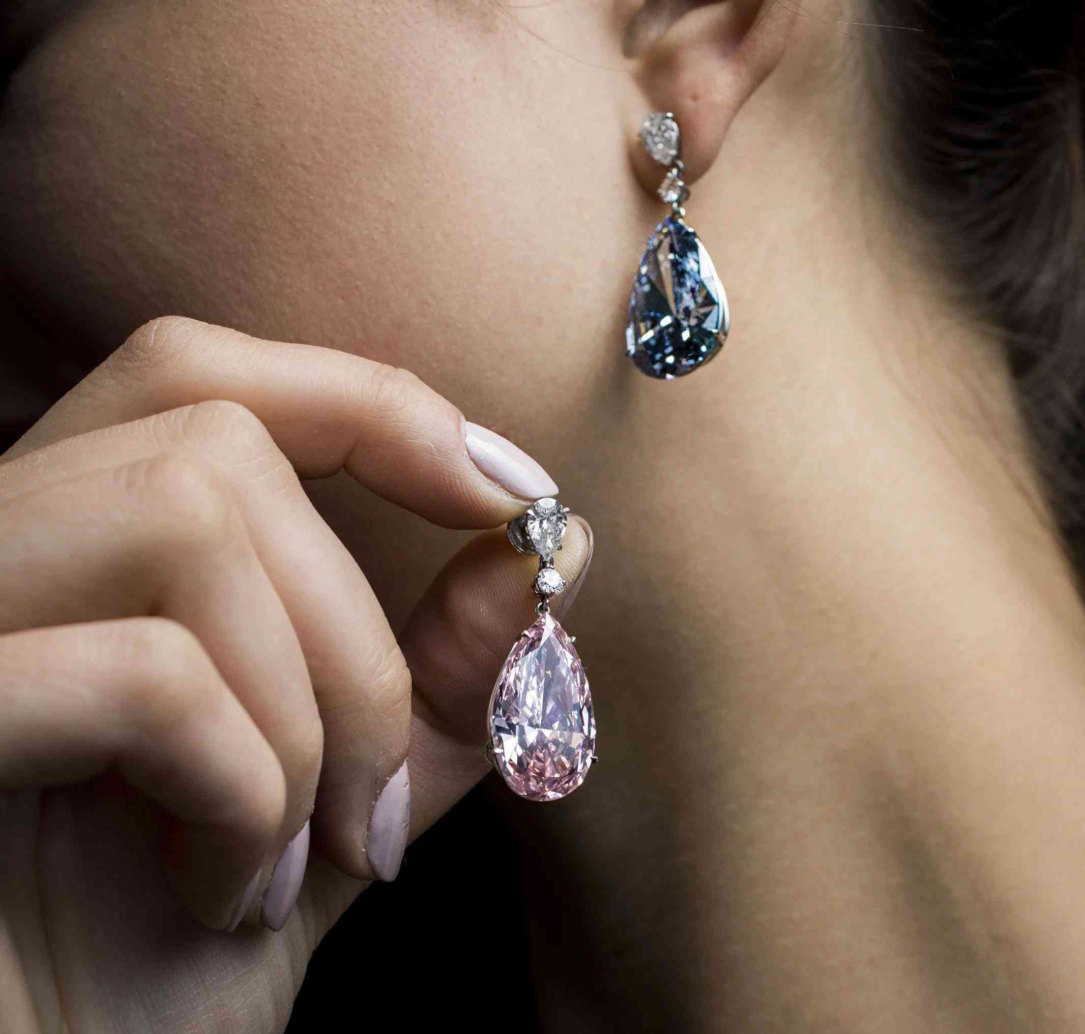 一对不相配的彩色钻石耳环以双胞胎神阿波罗和阿尔忒弥斯的名字命名,昨天在日内瓦苏富比以 5740 万美元的总价售出,创下拍卖纪录。这对粉色和蓝色梨形双耳环现在拥有拍卖会上最有价值的一对耳环的称号。