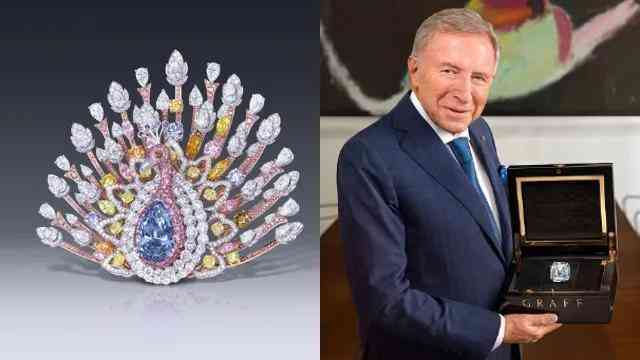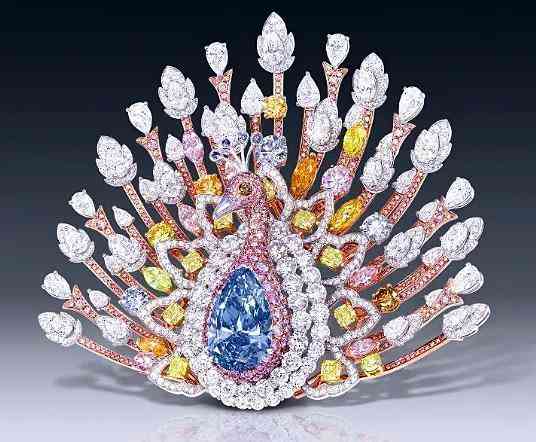 多年前,孔雀胸针由格拉芙公司揭秘,上面镶嵌了 1.305 颗钻石,其中一些是彩钻。总的来说,这枚胸针重 120.81 克拉,其中的明星是 20.02 克拉的彩蓝钻。