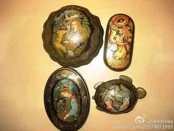 除了套娃还有漆盒(шкатулка)。шкатулка大概分两种。一种是下面这样手绘的。比如张图里面就是特别有名的漆盒产地Палех的作品,非常精致,也都是有画师签名的。尤其右上金光闪闪是因为都是描金的。这4个价钱都在1000到2000卢布,并不比套娃便宜,因为画一个这个很费事的。所以如果送人我不是很推荐送这个,因为普通人可能觉得套娃看着特实在,这么一个巴掌大的小盒子如果不是特别识货的人可能还以为挺便宜呢。。。