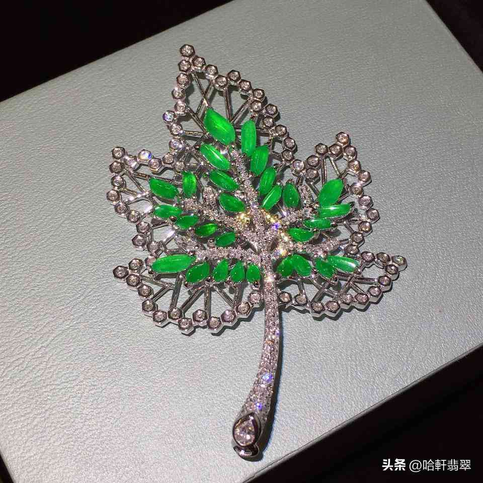 像上面这件满绿随形枫叶胸针,便是由一颗颗形状各异的翡翠边角料组装而成。