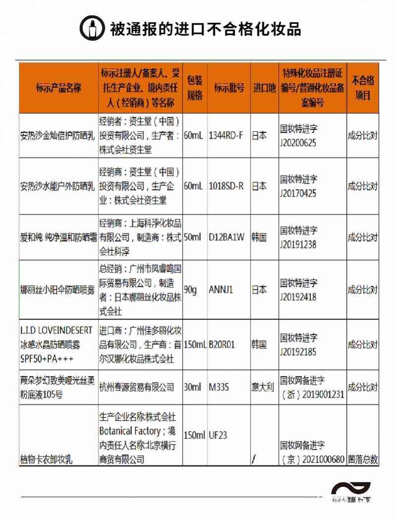 在近期官方的不合格化妆品通报中,还出现了多批次进口品牌的身影。如2022年的12月22日《国家药监局关于53批次不符合规定化妆品的通告》就通报了安热沙、爱和纯、娜丽丝等6批次进口化妆品。