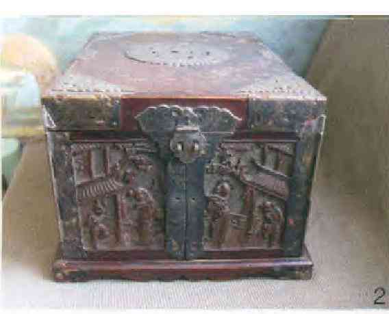最早记载的奁盒是西周时期是铜制的。铜边高5厘米,长12厘米,宽5厘米。它为矩形,直壁略微缩回。有两个小盖子可以在顶部分开。每个封面都是男女裸体的形象,面对面跪着。坐下在下部,有六个人形足,全裸,膝盖弯曲,双手在身体后面。盖子的两个表面都装饰有对称的梯形图案,主体是双层垂直刻度图案,而底部则装饰有菱形网状图案。