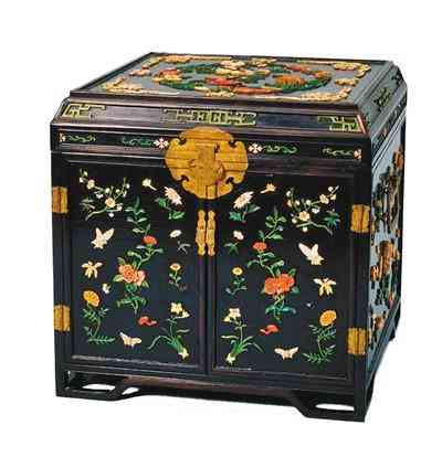区别在于整体装饰方法。首先,除了门外,大多数盒子都不是雕刻或涂漆的,而是用不同大小和形状的铜皮装饰。化妆盒上的一些化妆品几乎被液体覆盖。每块铜皮上都刻有凿线,内容主要是花朵,文字,如意,人物等。切口处衬有彩色丝织物。其次,除了梳妆盒门上的浮雕装饰外,浮雕上还将浮雕大面积的金,沙,蜗牛,胶玻璃等装饰。在居住的地区,例如文成县,苍南县和泰顺县,在浮雕的底部还将用中国红,淡绿色和蓝色装饰。另外,在温州古代的梳妆盒中,存在着一种残存较少,更具地方特色的类型,即什锦梳妆盒。所谓"什锦"是指盒子的内部有十多个小块,每个正方形都有一个盖板,并且盖板上的底色以浮雕的形式表现出来,而雕刻的装饰品则是各种花朵,水果,硬币,杂项宝物等。 "什锦"可能由此而来。