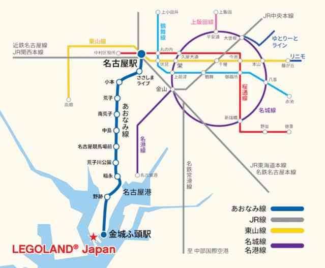 如果你是坐火车到达的 名古屋 ,那么也可以直接在 名古屋 站乘坐地铁青波线,20分钟到达金城埠头地铁站,然后步行5分钟到达 日本 乐高乐园酒店(见下图)。
