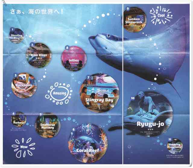 ⭐️11大主题区:场馆内总共分为11个主题区域,包含 【浅滩环礁(Shoaling Ring)】、【木曾川(Kiso River)】、【触摸池(Rockpools)】、【港口(Harbour)】、【海马苗圃(Seahorse Nursery)】、【珊瑚礁海(Coral Reef)】、【鳐鱼湾(Stingray Bay)】、【果冻水母(Jellies)】、【沉没船(Sunken Shipwreck)】、【龙宫城(Ryugu-jo)】、【奇妙创作坊(Amazing Creations)】,每个主题都有不同的灯光与气氛。