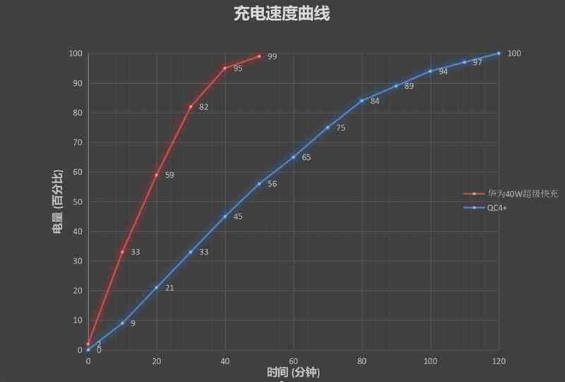 我们以支持QC4+的某4500毫安时电池机型关机充电对比开机充电的华为nova 6 SE,可以比较直观地了解18W高压快充与40W低压大电流方案之间的区别,可以看出就充电时间而言两者绝不是由最高功率数值入手计算的2.2倍之差,至少要达到2.4倍。
