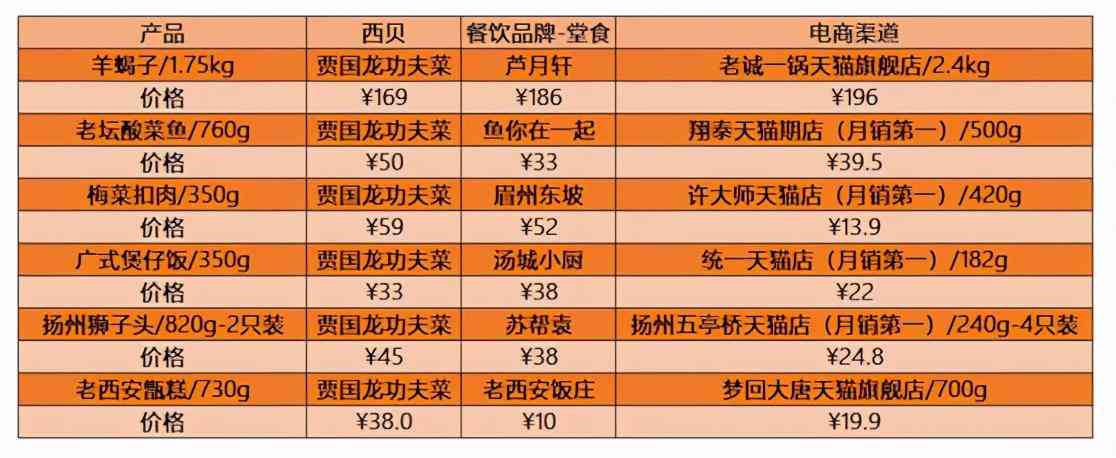 点评和网络上对功夫菜吐槽最多的还是价格,因此我们将功夫菜的主打产品与部分餐饮的堂食、电商的同类产品进行价格横评,从结果上看,西贝功夫菜比两者的价格都高出不少。