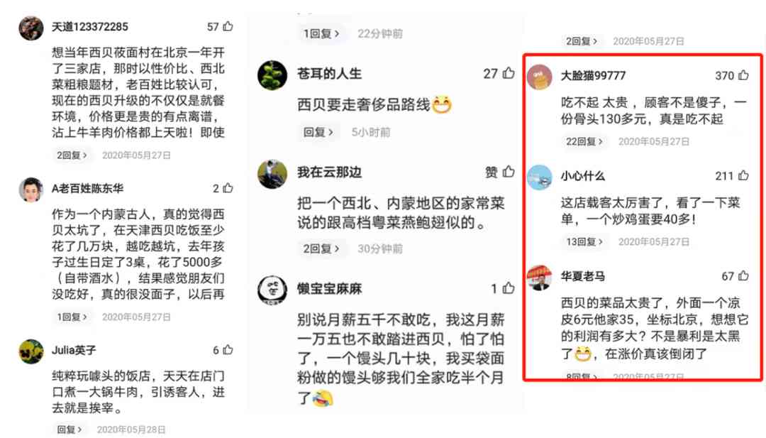 第二是“月薪5000元以下不配吃西贝”引发了公愤。众所周知,西贝有意通过高定价对客群进行筛选,用来维持“高端品牌”的调性。2016年贾国龙曾向媒体描述过西贝的人群画像:“年纪都在30岁以上,而且一年家庭收入至少要有40万元”。因此对于那些抱怨价格高的客群,西贝战略上选择了放弃。