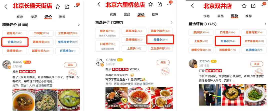 而对于主要布局一、二线城市购物中心的西贝来说,本身就承受着更高的人力和房租成本,其压力感受更为深刻。所以既然不敢明着来,就只能通过“减少分量”变相“涨价”。我们从西贝在“北上广深”四地门店的大众点评里可以看到,有关“分量小”的评价非常突出。