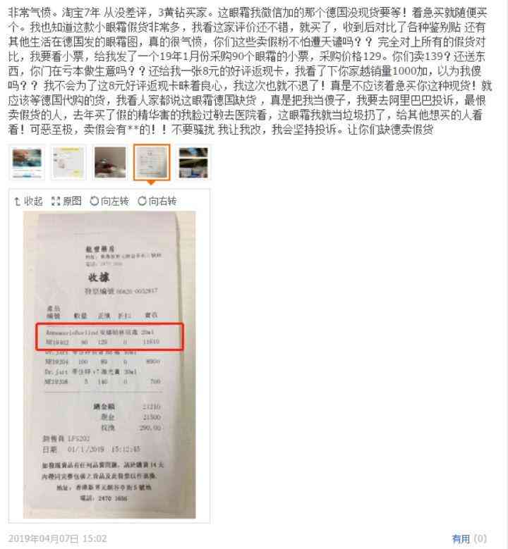 还是以一个我比较熟悉的眼霜为例,假货店的评价是这样的