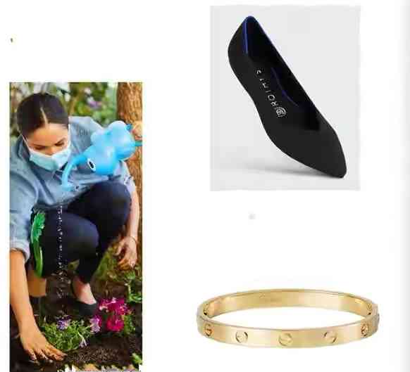 在戴妃纪念日这一天,梅根穿一件蓝色衬衫做公益,下身配一条深蓝色牛仔裤,一身蓝色系很有层次感,席地而坐种婆婆最喜欢的花,挽起袖口手腕上的卡地亚黄金镶钻手镯抢镜!