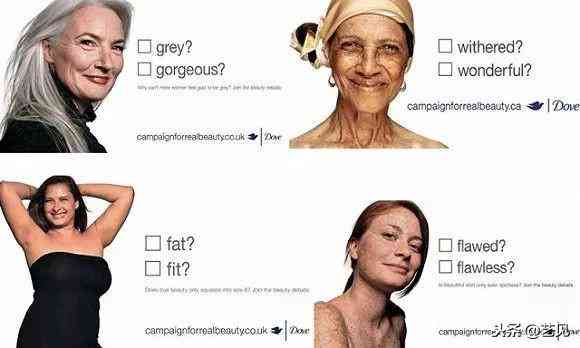 多芬的广告中展现出了不同的美:胖、皮肤有缺陷都可以是美丽的。