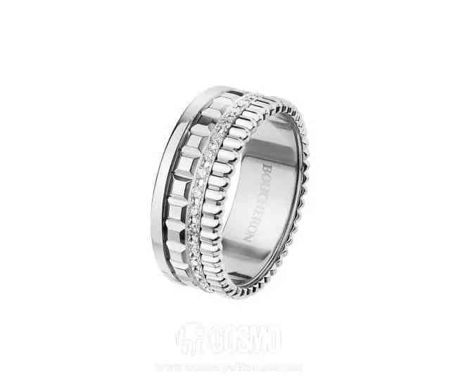 宝诗龙珠宝系列中最经典的当属2004年首次面世的Quatre系列了,Quatre单钻订婚戒指上铺满了钻石并搭配了弗雷德里克-宝诗龙先生最标志性的饰纹——Grosgrain罗缎带图案。在法文中,Quatre一词是“4”的含义,这也意味着这个系列的奇妙之处:这个系列有四种不一样的环形,有多种不一样的搭配手法,你可以选择只戴一只,你也可以选择2-4个指环叠戴的手法,非常有趣。