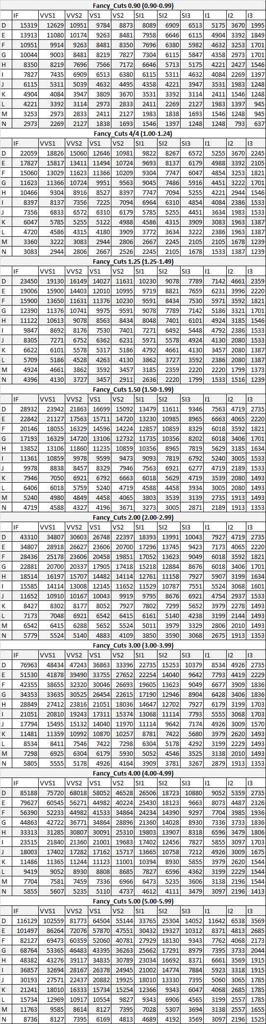 该报价表根据4C分级给出钻石零售的建议,所列出的报价代表目前市场上成交的高位零售价,以此为不同商业模式的商家留出足够的空间。该报价表仅作为一种参考的背景信息,实际交易价格由卖家决定。