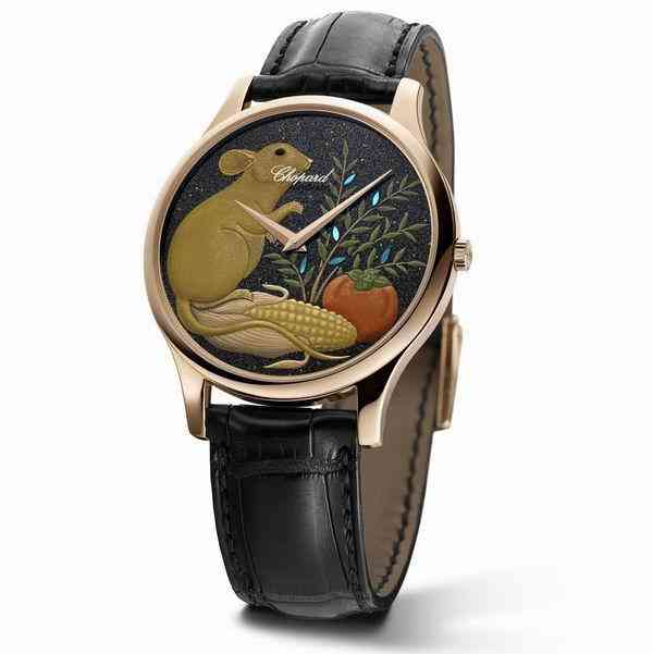 Chopard萧邦特别与日本皇室御用漆器供应商山田平安堂(Yamada Heiando)合作,采用日本传统莳绘工艺,倾心打造此款腕表。表盘上,一只金鼠站在象征丰收富足的玉米穗上,其旁绘制一只柿子,这种采摘于冬季的水果象征着福寿绵长。金鼠对面还有一束鲜花,呈现蓝、金、绿三种幸运色彩。