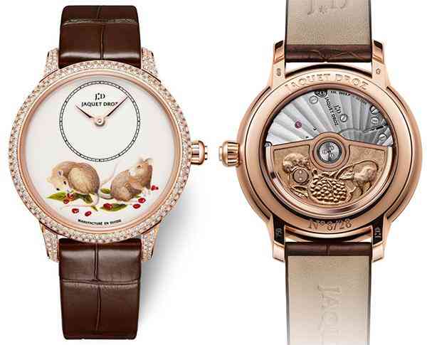 雅克德罗鼠年时分小针盘腕表采用微绘珐琅工艺绘制出灵鼠与石榴的美好景象。