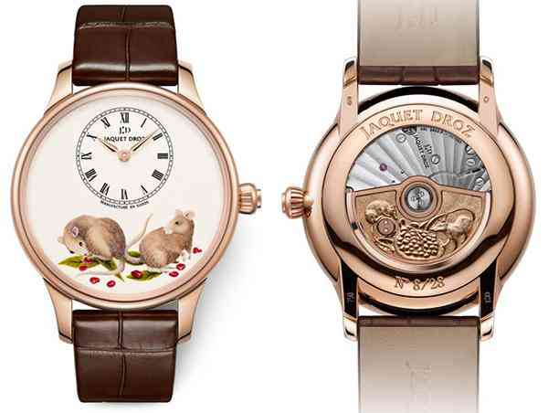 每款珠宝腕表的石榴果均以红宝石雕琢而成,9点钟位置的数个种衣采用雪花式镶嵌,鼠爪则抱着一颗尺寸较大的红宝石石榴籽。珍贵材质的巧妙配搭(钻石、金、红宝石)突显出老鼠的自然天性——热情、雄心勃勃、富有创造力,象征着繁荣昌盛。两款腕表遵循雅克德罗艺术作品限量发行的传统,仅限量发行8枚。