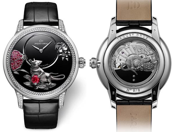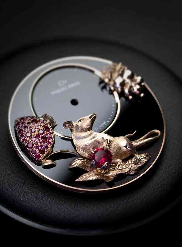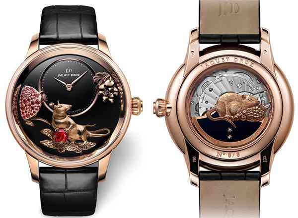 雅克德罗鼠年时分小针盘腕表采用精雕工艺纤毫毕现地呈现灵鼠的形态,更采用红宝石来表现红石榴的晶莹剔透。