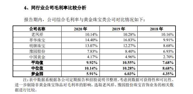尽管梦金园近年一直保持百亿营收,但招股书显示,其2018-2020年的综合毛利率分别为4.35%、6.03%、5.91%,而同期同行业可比公司毛利率均值分别为7.68%、10.55%、9.92%,约为梦金园毛利率的两倍。
