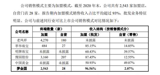 梦金园加盟店销售收入占比远超同行。红星资本局注意到,梦金园在招股书中承认其批发业务特征明显。梦金园称,公司销售模式主要为加盟模式,截至2020年末,公司共有2543家加盟店,自营门店28家,报告期内加盟模式销售收入占比平均超过9成。