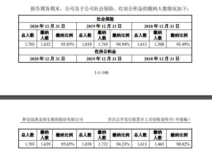 而在招股书中,梦金园称,截至2020年12月31日,公司及子公司员工共计1703人,已缴纳社会保险人数为1632人,占员工总数的 95.83%;未缴纳社会保险人数为71人,占员工总数的4.17%;已缴纳住房公积金人数为1629人,占员工总数的95.65%,未缴纳住房公积金人数为74人,占员工总数的4.35%。