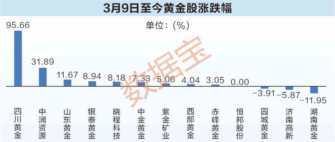 在金价狂飙的带动下,A股黄金上市公司迎来一波大涨。证券时报·数据宝统计,3月9日至今,四川黄金大涨95.66%,该股为3月“最牛新股”之一,录得上市20个交易日14涨停战绩;中润资源期间收获5连板,累计涨幅31.89%;山东黄金、银泰黄金、晓程科技等一众黄金股涨逾8%。