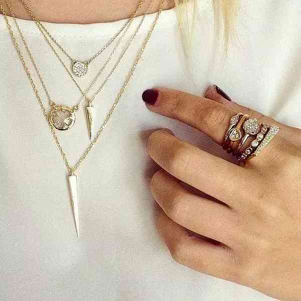比较粗的金色戒指可以放在根部,细一点的款式则在上方,中指的戒指尽量带上细型的款式,会让你的手指会看起来更加修长。