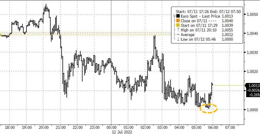 北京时间7月12日17时许 , 欧元兑美元一度触及甚至跌破平价(即1欧元兑1美元),该货币对日内最低摸到0.99999。上一回见到这种情况,还要追溯到2002年的12月。