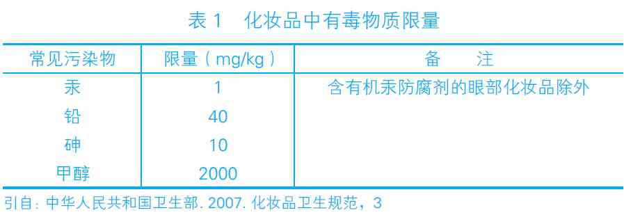 化妆品中有毒物质不得超过表1 中规定的限量。