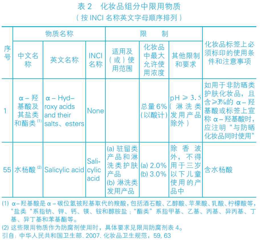 水杨酸和果酸被广泛应用在化妆品中,在《化妆品卫生规范》里都有明确的使用限制,包括浓度和最低酸碱度(pH)值(表2)。
