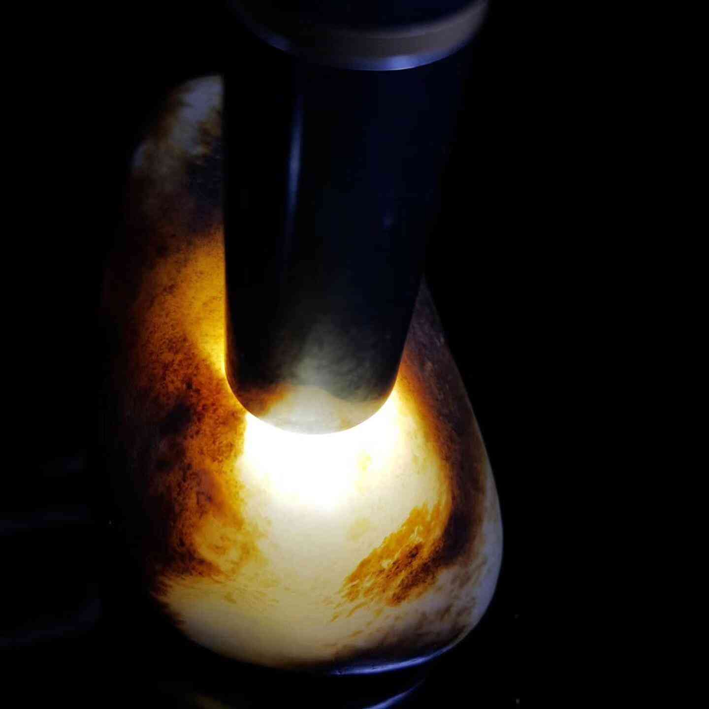 和田玉的细腻度取决于籽料形成时的玉化程度,玉化得好,细度就好;玉化不好,颗粒就会粗,肉眼或灯下能看到明显的结构,甚至会出白花点。这些结构特征一般在自然光下是很难看清楚的,这也就是我们所要说的,和田玉一定要打灯看的部分,也就是和田玉的结构!