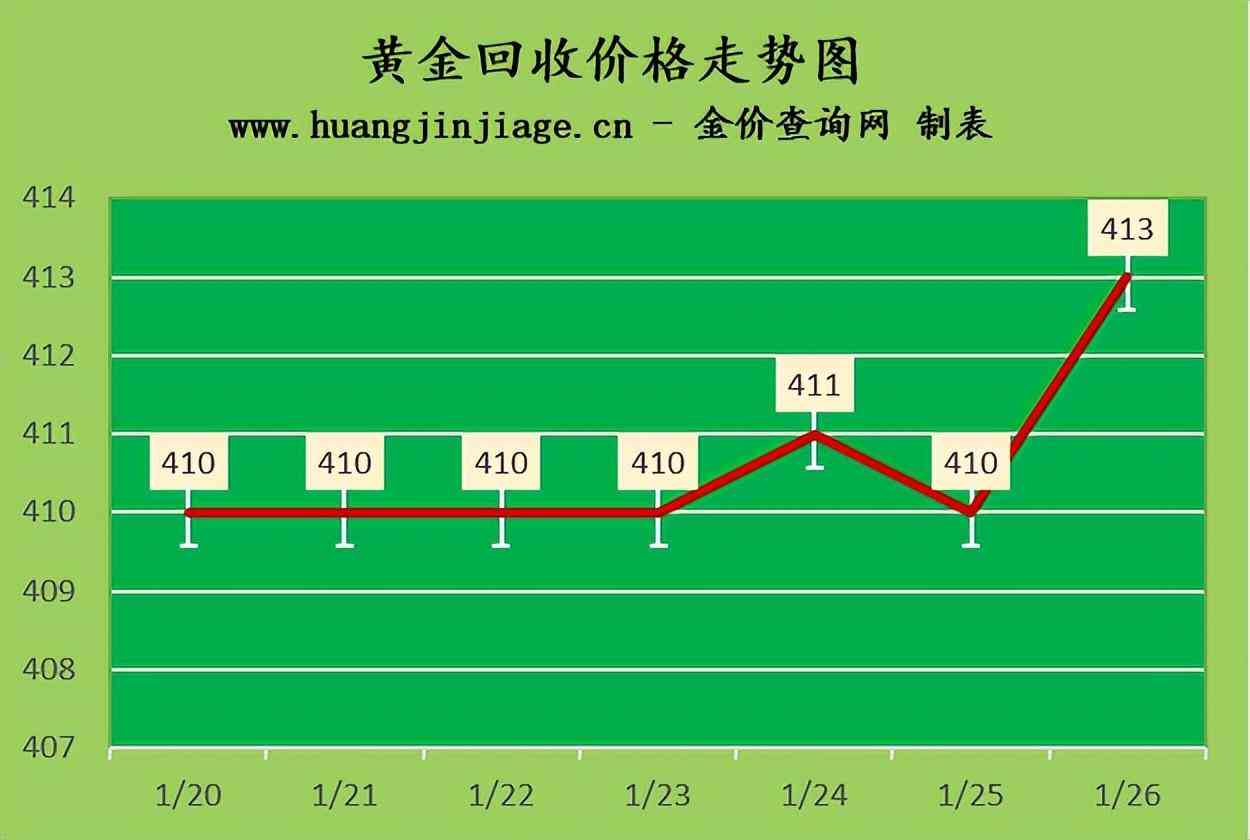 黄金回收价格413元/克,铂金回收价格196元/克,钯金回收价格332元/克,18K金回收价格300元/克,银条回收价格3.8元/克。(黄金行情是波动的,回收金价没有固定标准。)