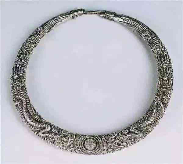 【项圈】颈饰是原始社会就很普遍的装饰,春秋战国时代的颈饰出土不少,河南三门峡上村岭虢国墓地出土颈饰,其中一件系由许多不同形状的〓组成,其余为〓形器及一小系璧。