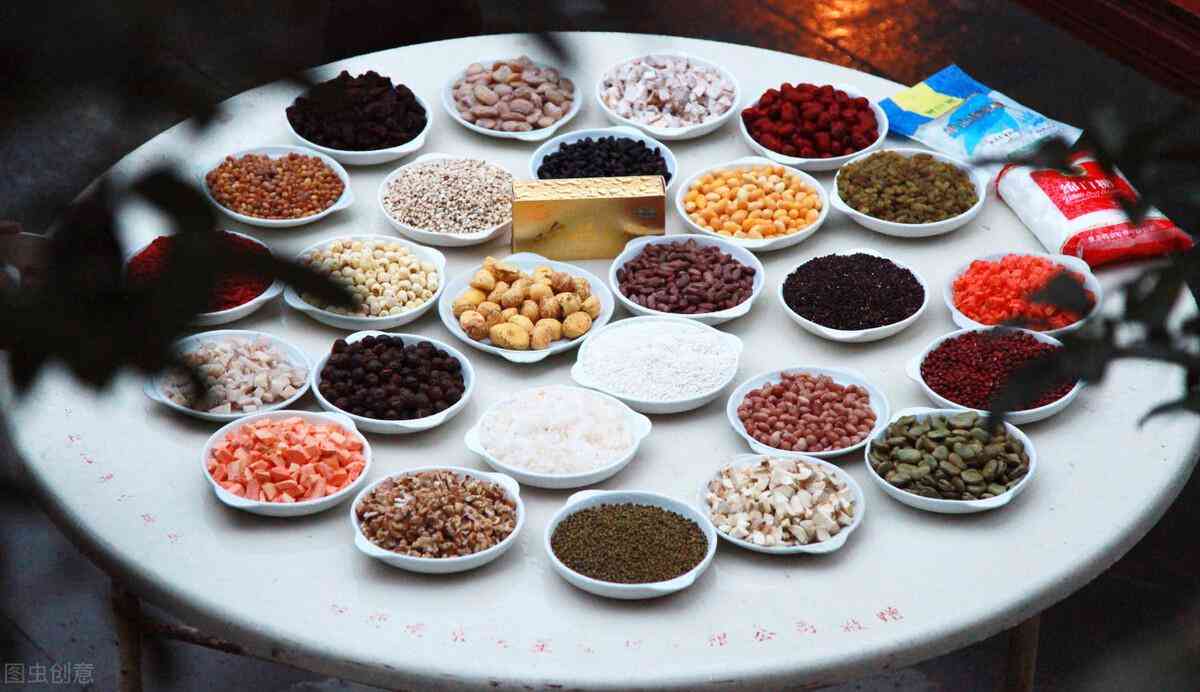 腊八粥,起源于古代腊祭,用来庆祝丰收,一直流传至今。《礼记·郊特牲》:“岁十二月,合聚万物而索飨之也”。腊八粥以八方食物合在一块,和米共煮一锅,有合聚万物、调和千灵之意。腊八粥的食材,因各地物产有所不同。