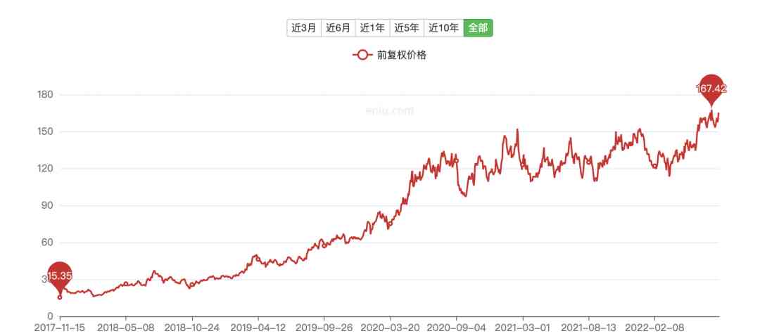 珀莱雅持续而稳定的业绩表现也得到了资本市场的持续认可,自上市以来股价持续上升,在15.34元的发行价的基础上已经持续上涨12倍。在整个资本市场都属少见。有投资人甚至戏称其“硬过茅台”。