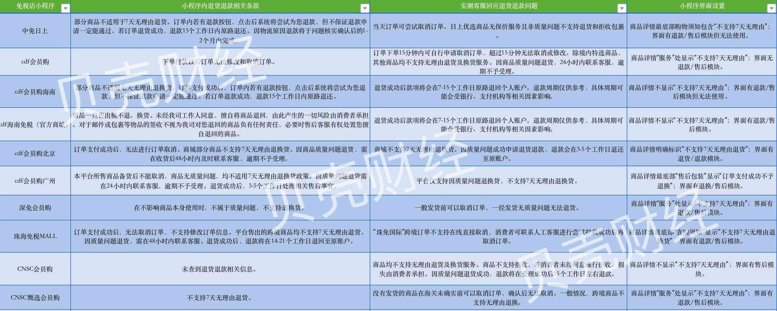贝壳财经记者实测发现,中免、深免、珠免、中出服四大免税企业旗下的10家免税品网购小程序境外商品均不支持7天无理由退换货,且在小程序相关购物须知和客服回应中不乏“付款15分钟后不能取消订单”“消费者拒收不能退款”“商家签收拒收产品不代表同意退货退款”“退款将于问题核实后1-2个月内完成”等条款。