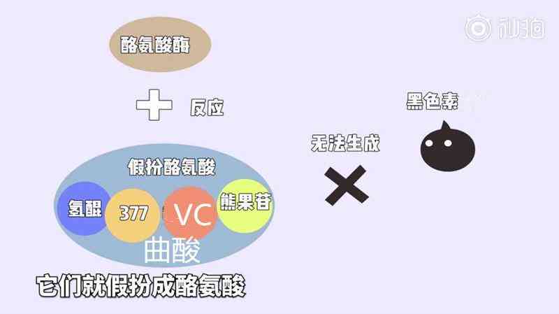 主要起作用的成分有:氢醌、377、维C、熊果苷、曲酸。他们主要是假扮成酪氨酸酶和酪氨酸酶反应,使之无法生成黑色素。