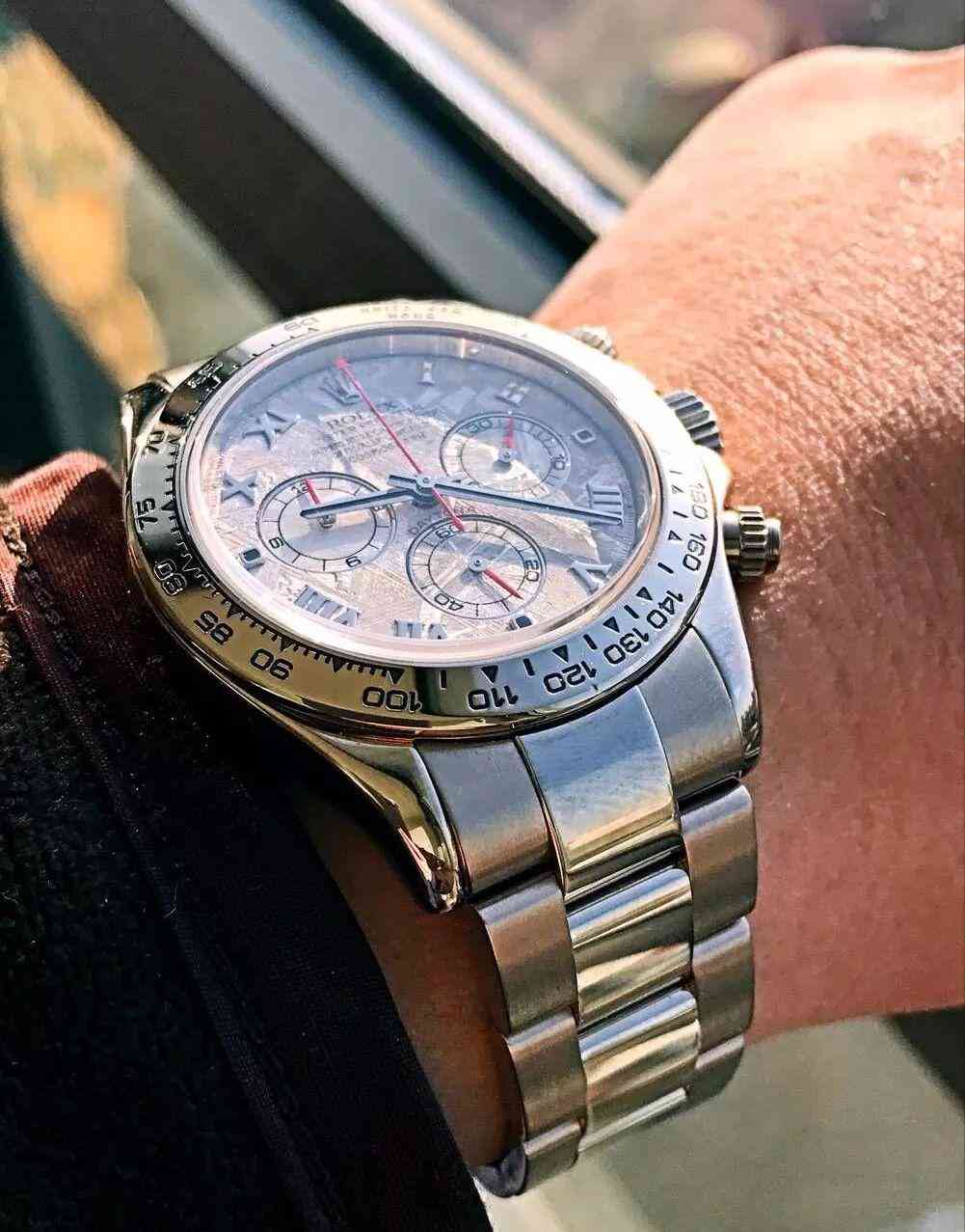 说起特殊盘面,陨石面是其一,劳力士使用的“ Gibeon”陨石是1838年(也有说法是1836年)在非洲纳米比亚沙漠被发现,猜测是8万年前坠落的陨石。至于现在受纳米比亚法律保护,这儿已经被禁止开采陨石。“Gibeon”本身体积庞大,价格昂贵,但现在就很少了。