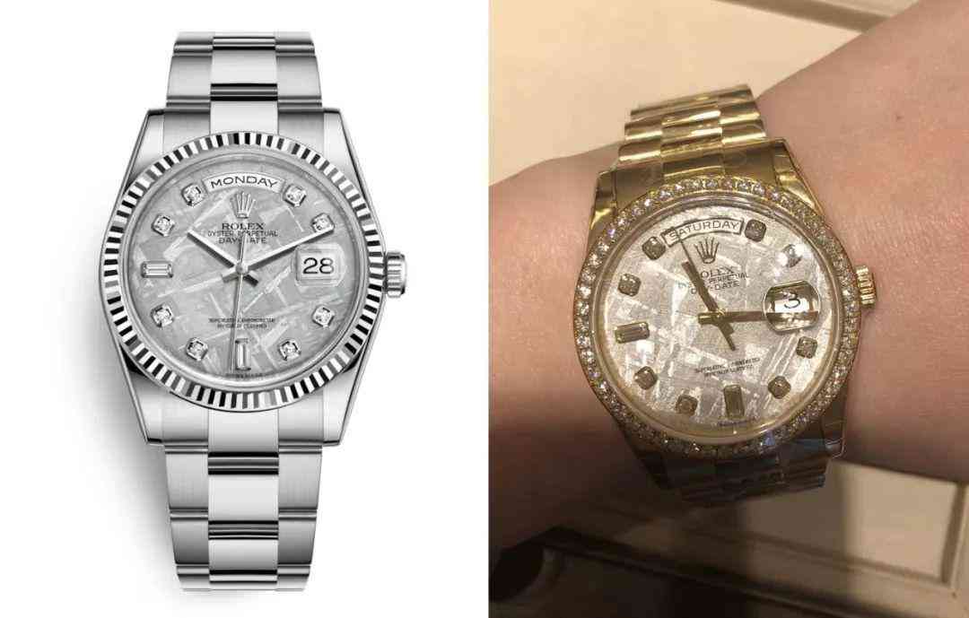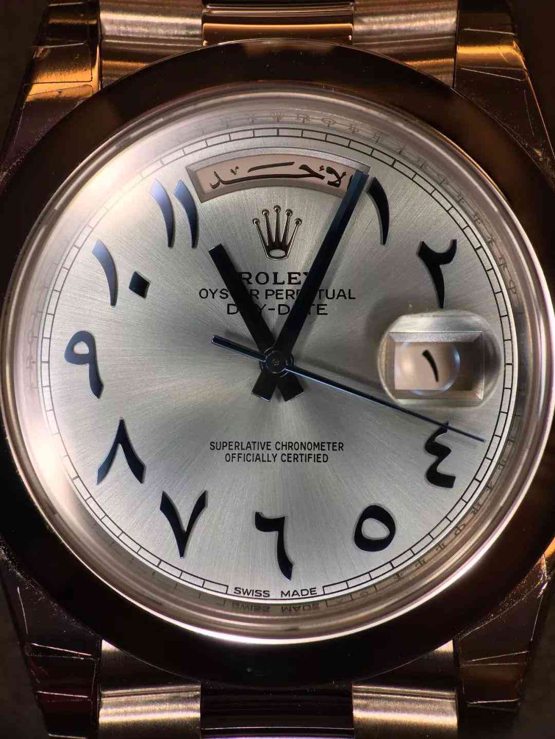 目前,劳力士陨石面还是在产的(应该是屯了不少原料),比如星期日历型(DD)就有,有白金也有黄金款,兔子在店铺上手了黄金款。