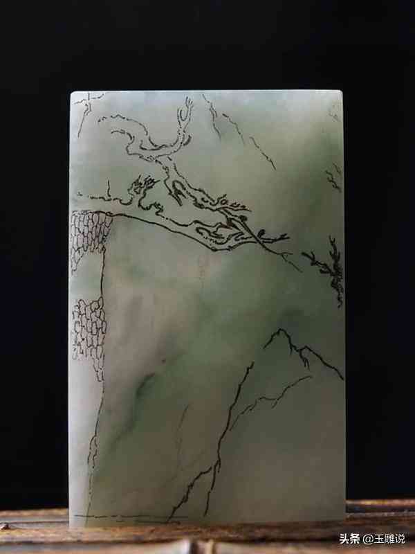 玉雕师把料子切割取了一件工整的方牌,经过对料子特征的分析,怀着对地藏王的敬仰,玉雕师决定拿这件翡翠创作一件地藏王菩萨。在分析了翡翠玉料上的色彩走向与绺裂分布,玉雕师用油笔在玉料上绘画出整个题材的布局以备雕刻。