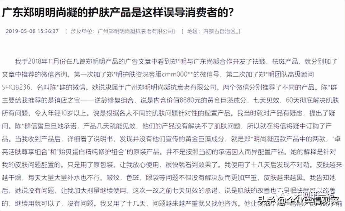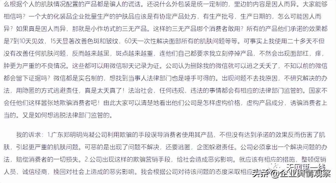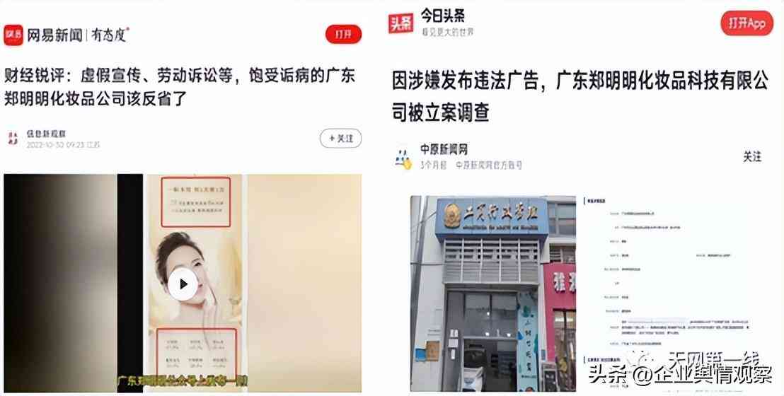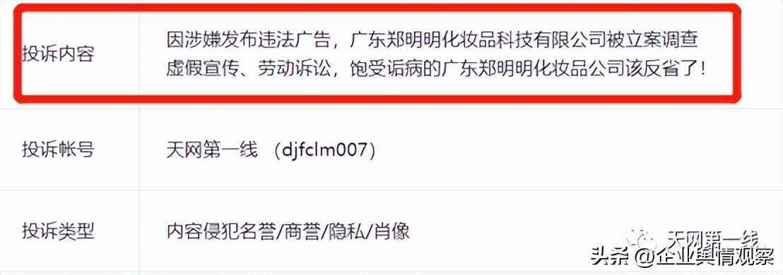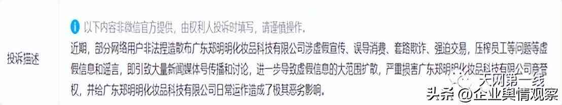 其投诉本平台发布的《因涉嫌发布违法广告,广东郑明明化妆品科技有限公司被立案调查》、《虚假宣传、劳动诉讼、饱受诟病的广东郑明明化妆品公司该反省了》两篇文章侵犯名誉/商誉/隐私/肖像权,并将投诉描述成“非法捏造散布虚假宣传、误导消费、套路欺诈、强迫交易、压榨员工等虚假信息和谣言”。